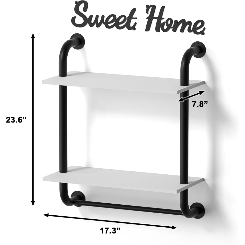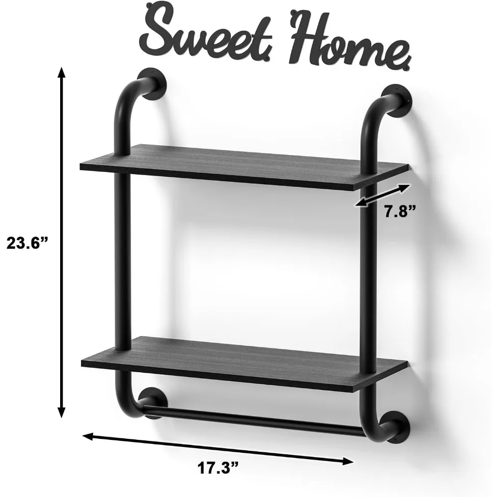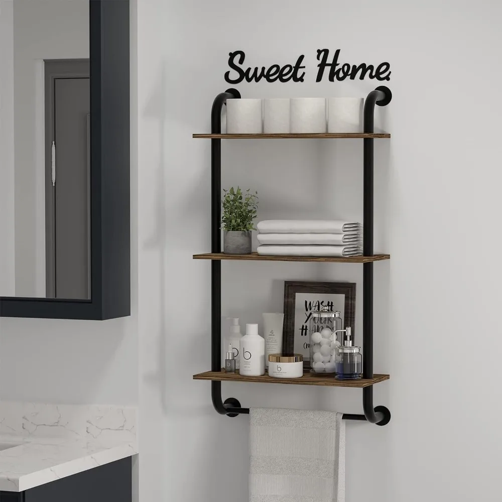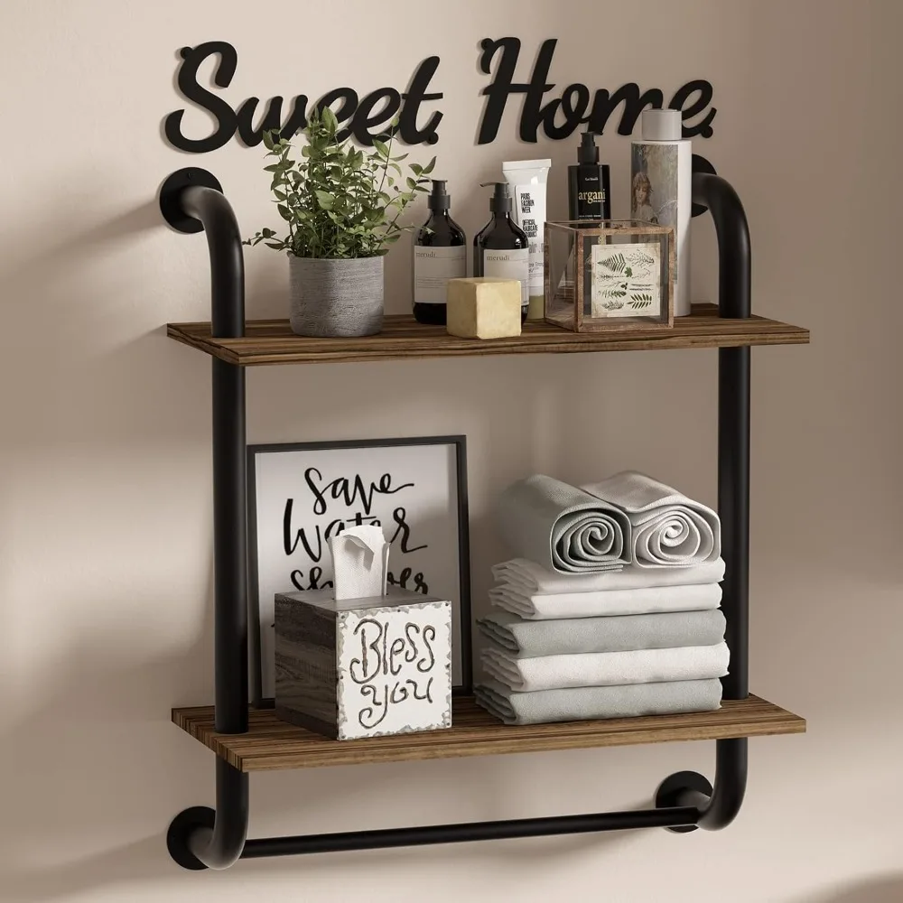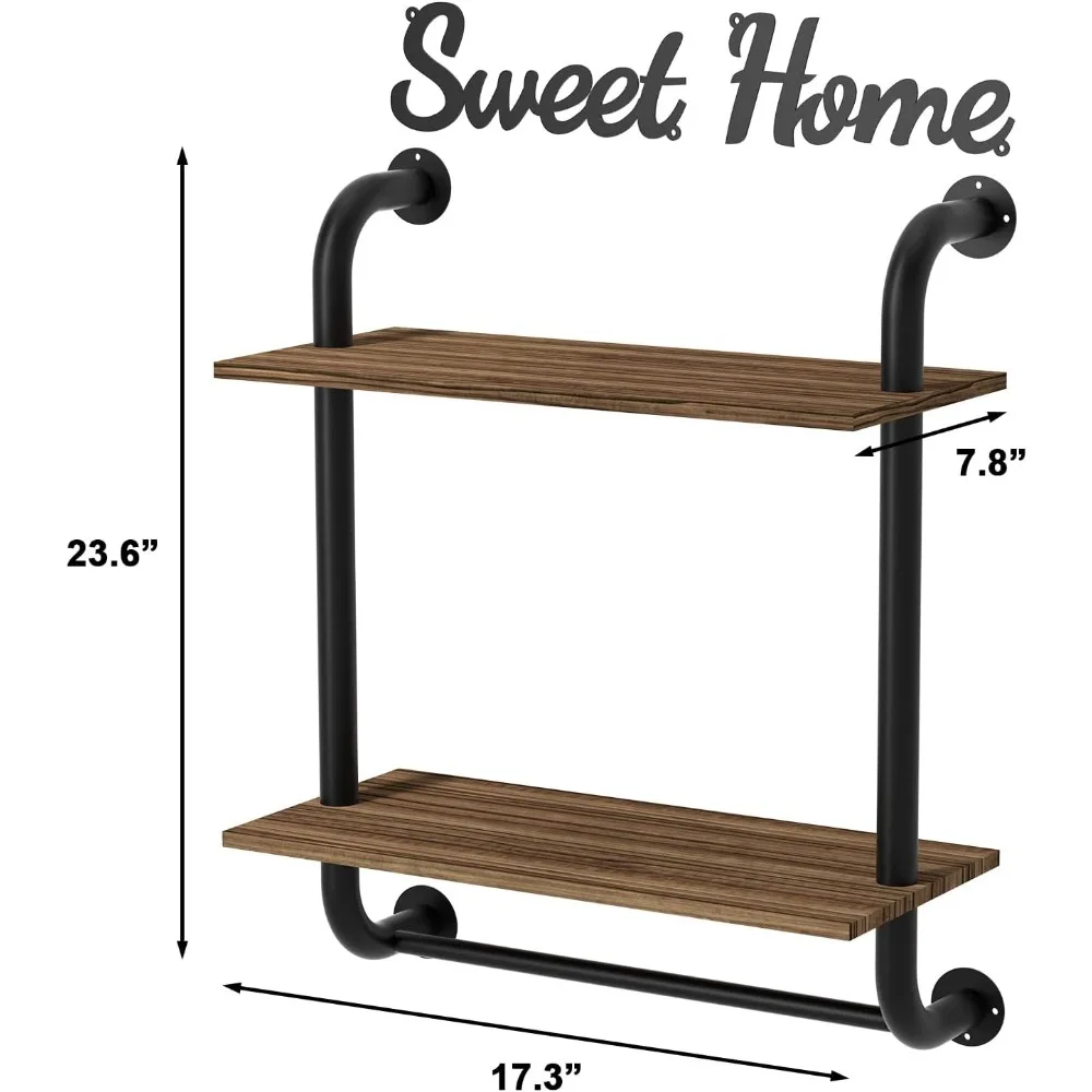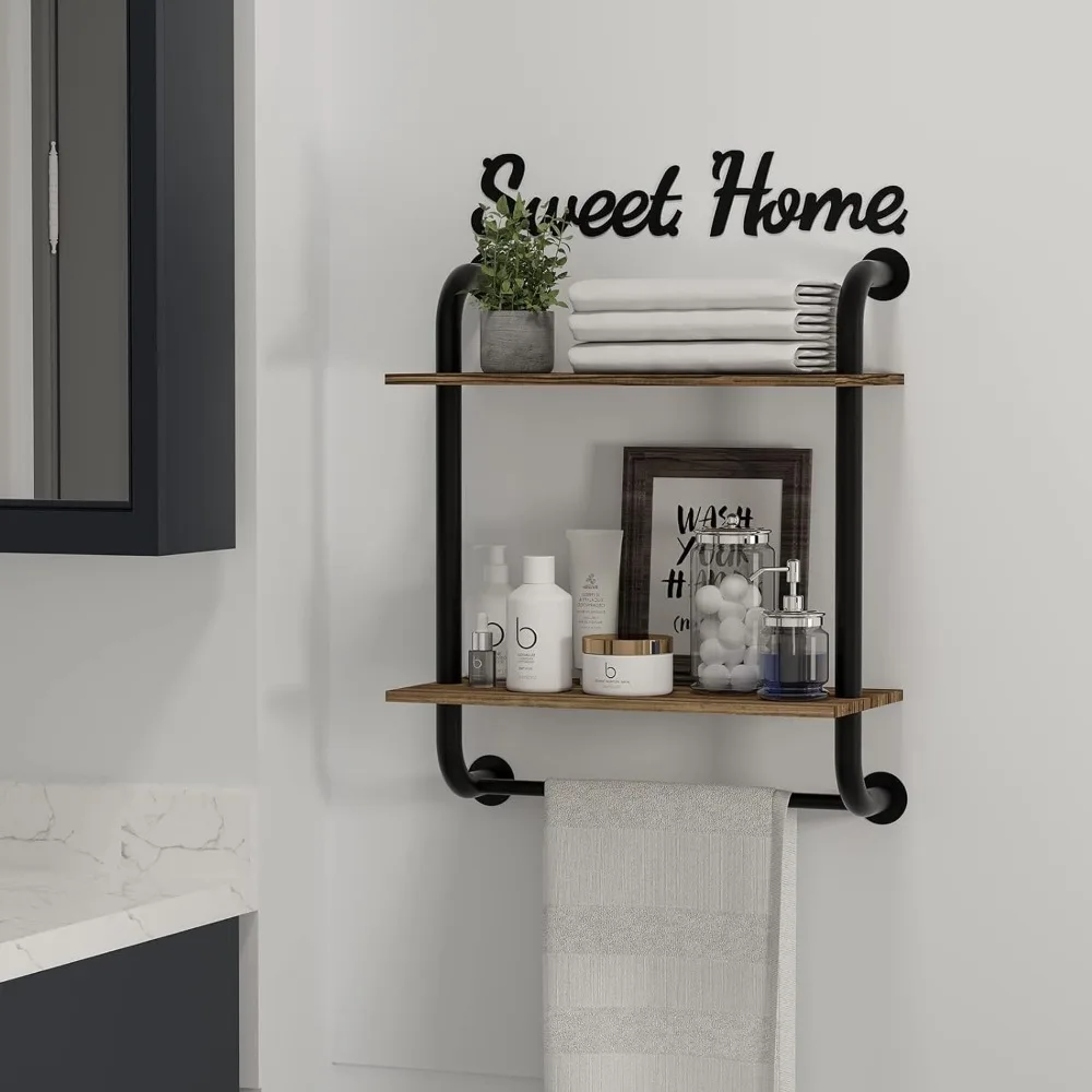 - Retro Rustic Industrial Style: The rustic wood wall shelf for bathroom with industrial pipes adds a touch of vintage farmhouse to your home. "Sweet Home" decorating logo also brings an atmosphere of warm sweet home. You can decide whether to assemble the "Sweet Home" decorating logo or not.