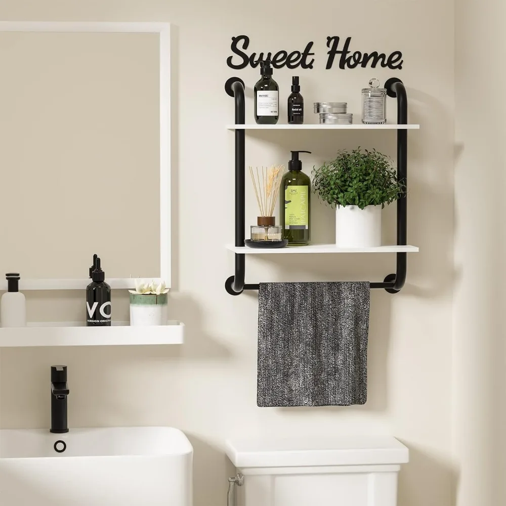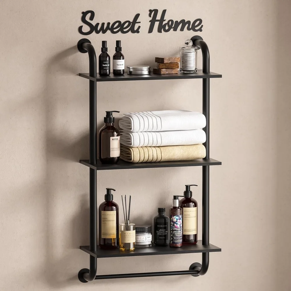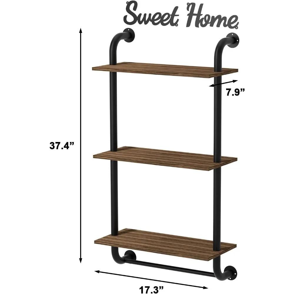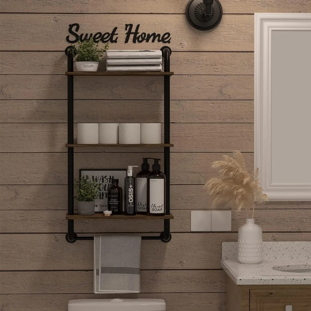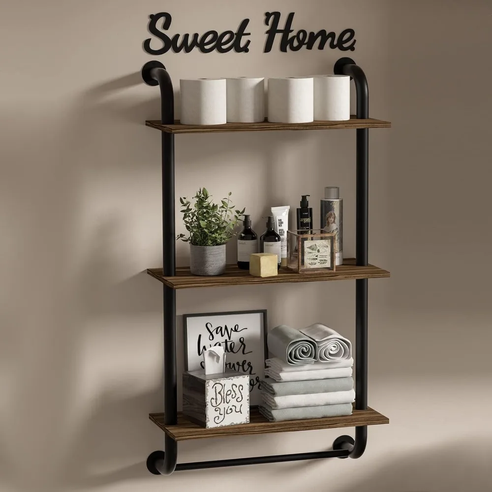- Retro Rustic Industrial Style: The rustic wood wall shelf for bathroom with industrial pipes adds a touch of vintage farmhouse to your home. "Sweet Home" decorating logo also brings an atmosphere of warm sweet home. You can decide whether to assemble the "Sweet Home" decorating logo or not.