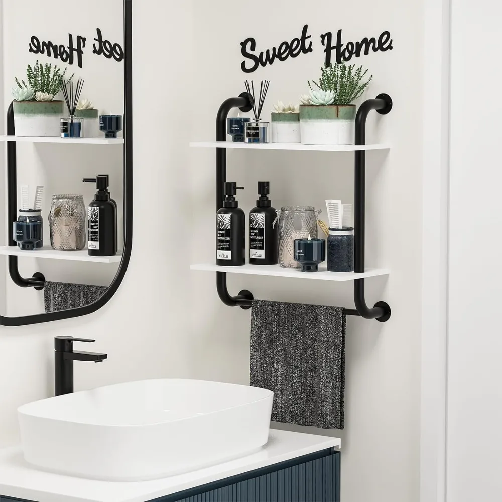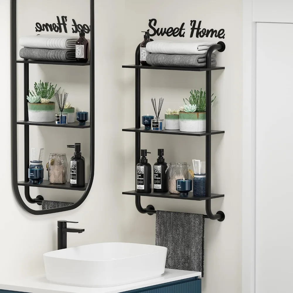 - Widely Use: The black bathroom shelf wall decor is suitable for bathroom, bedroom, living room, powder room, balcony, kitchen, toilet, sauna, poolside, spa. Each wood shelf can be fully stocked with bathroom accessories, souvenirs, photos, books, trophies, towels, word decorations, green plant decoration, spice, bowls and plates.