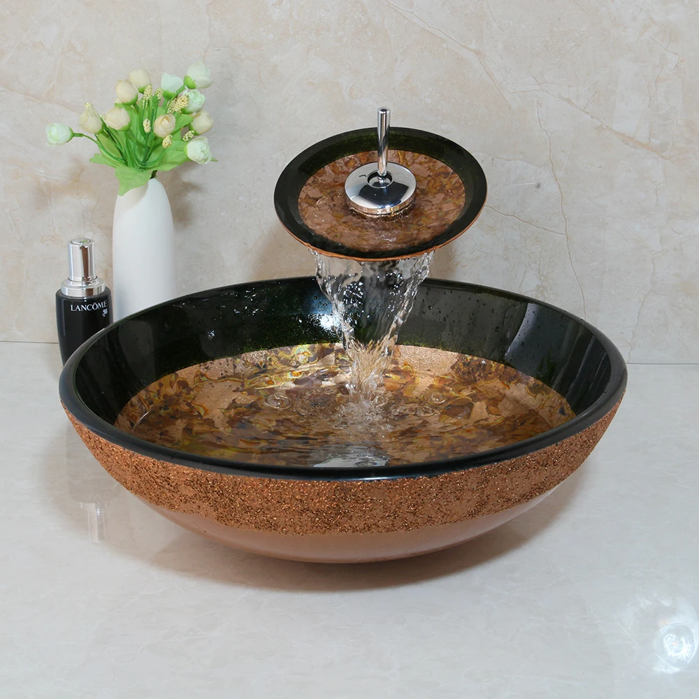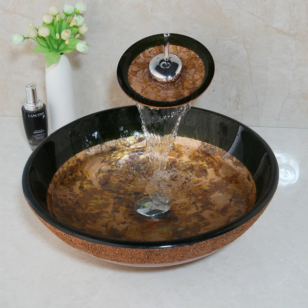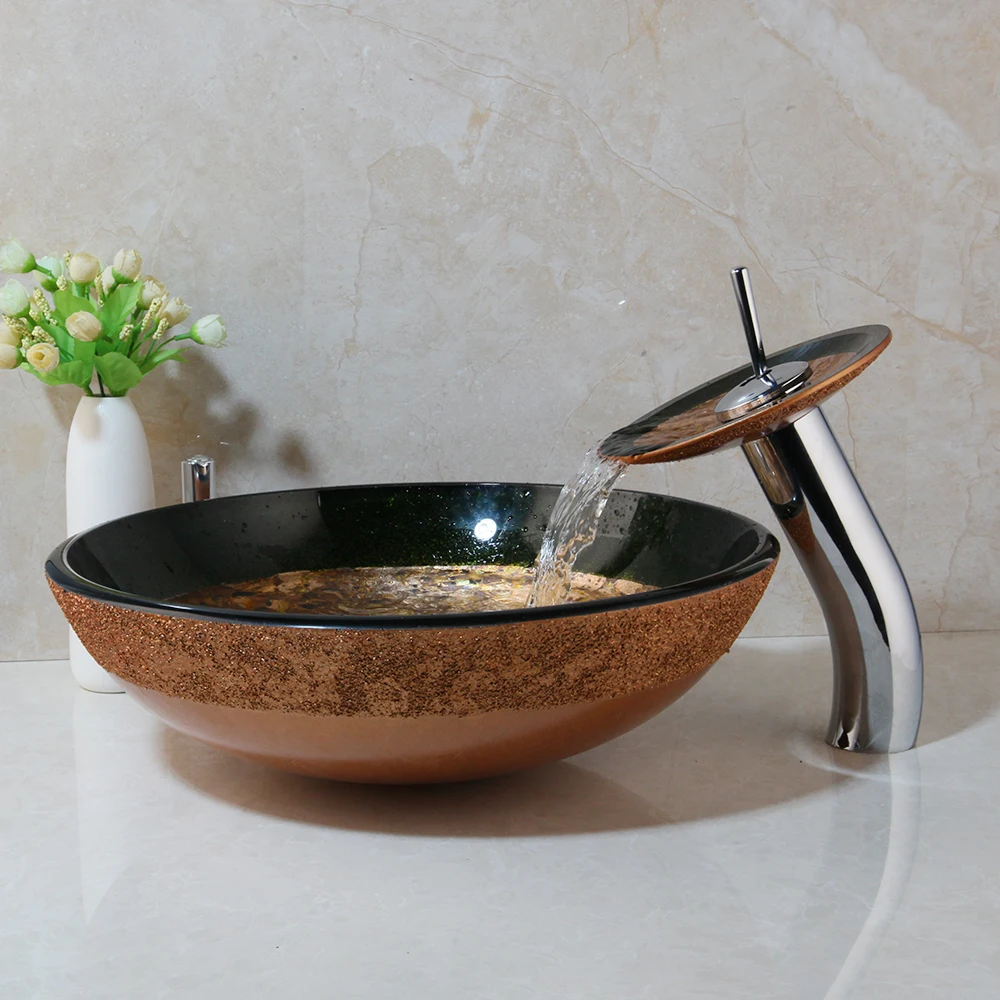 Countertop Basin Sinks Bathroom Victory Vessel Washbasin Tempered Glass Sink With Chrome Waterfall Faucet Sets