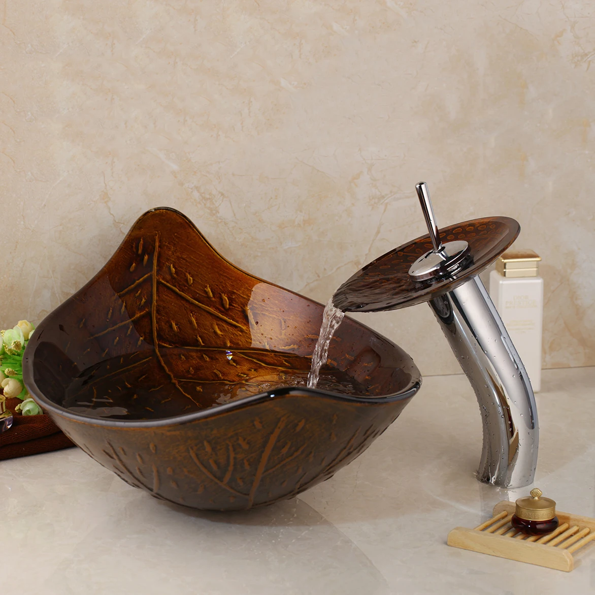 Waterfall Basin Faucet Combo Artistic Tempered Glass Oval Vessel Sink Above Counter Glass Bowl Bathroom Sinks with Mixer